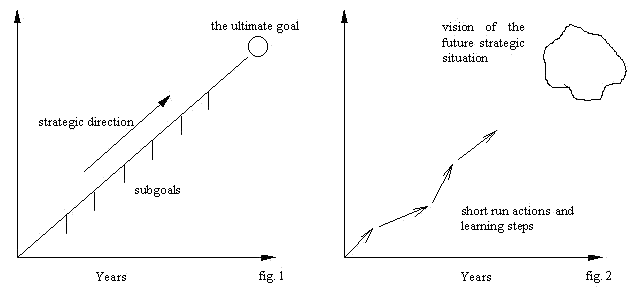 Where the traditional planning process (shown in fig. 1) had ist goals, subgoals and action plans, the new strategic planning approach (as shown in fig. 2) is characterised by short run actions and learning steps.
