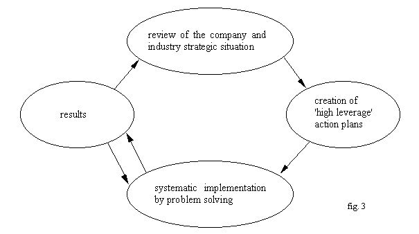 The realisation of the total business concept reqires the creation of high leverage action plans (as shown in fig. 3). Based on the results of the strategic review the management focus on those actions relevant for a winning strategy. In addition there are five imporatant preconditions that have to be carefully planned: